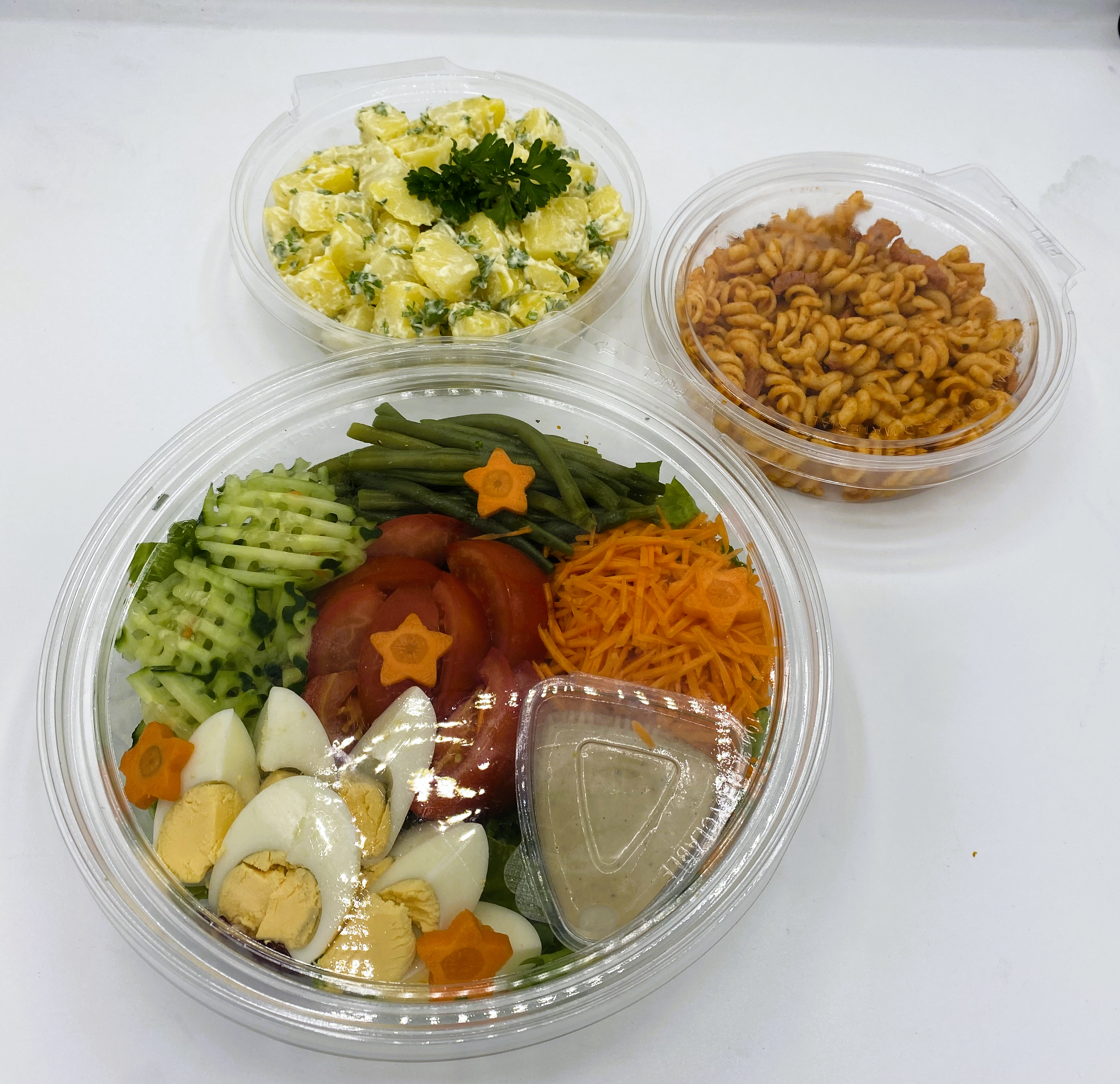 Inhoud: Gemengde sla, worteltjes, boontjes, tomaat, komkommer, gekookt eitje, dressing aardappelsalade & pastasalade met spekblokjes